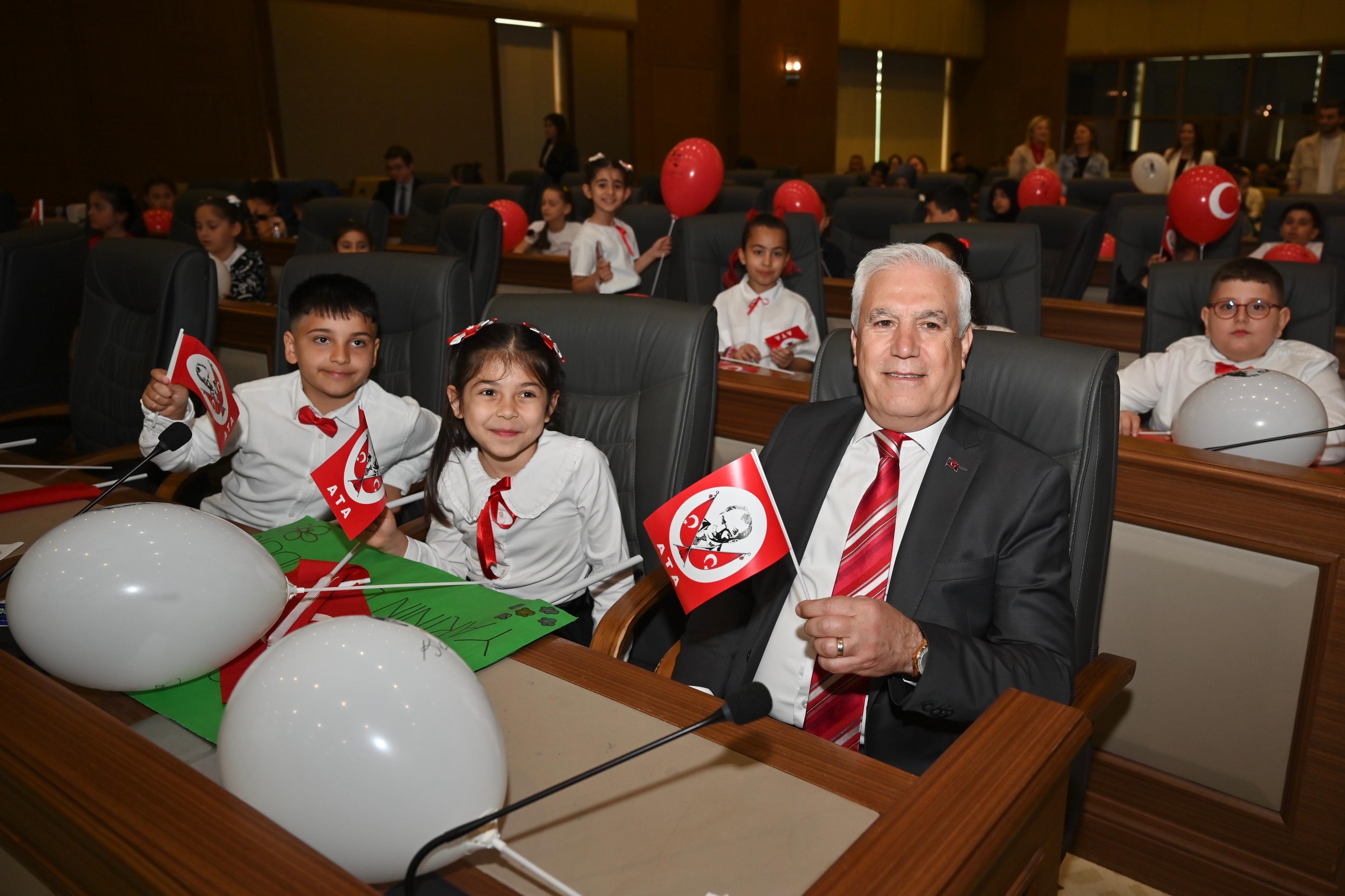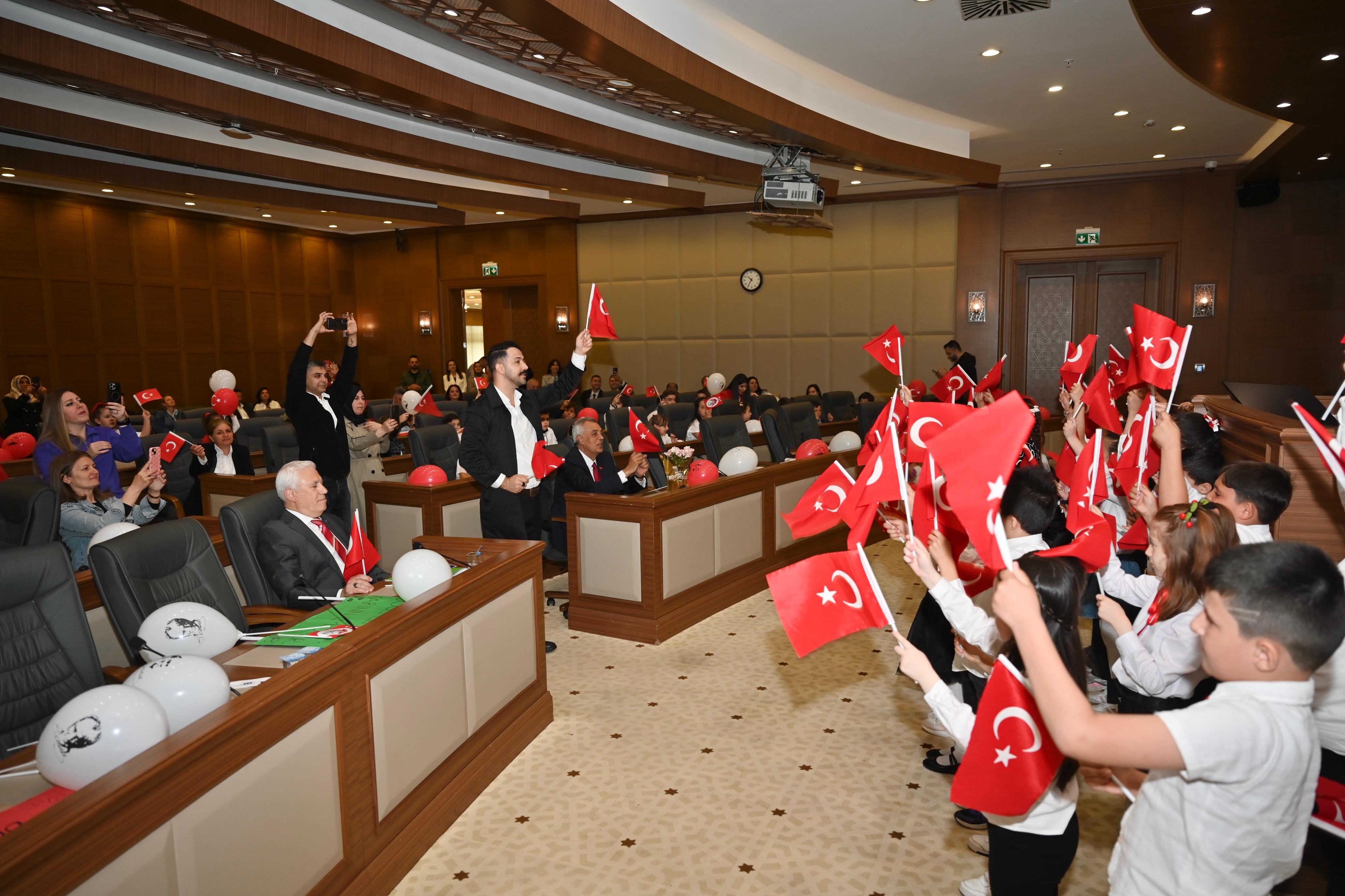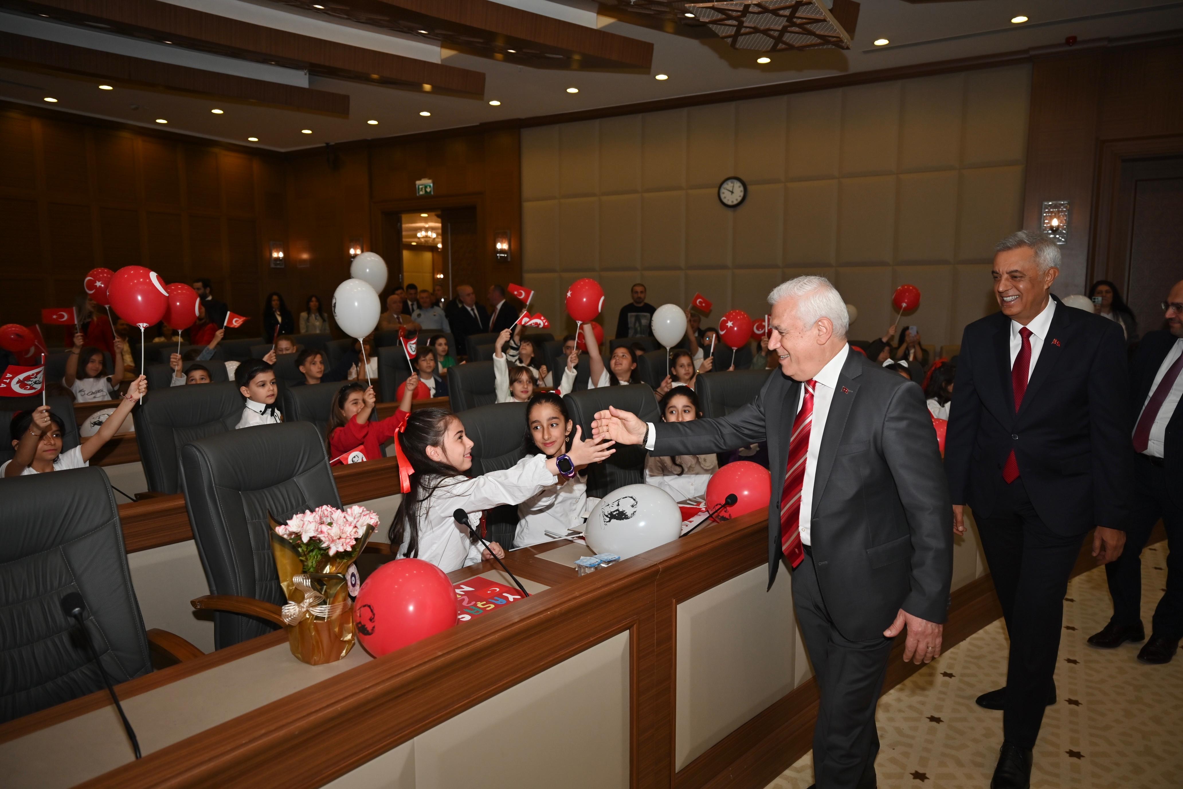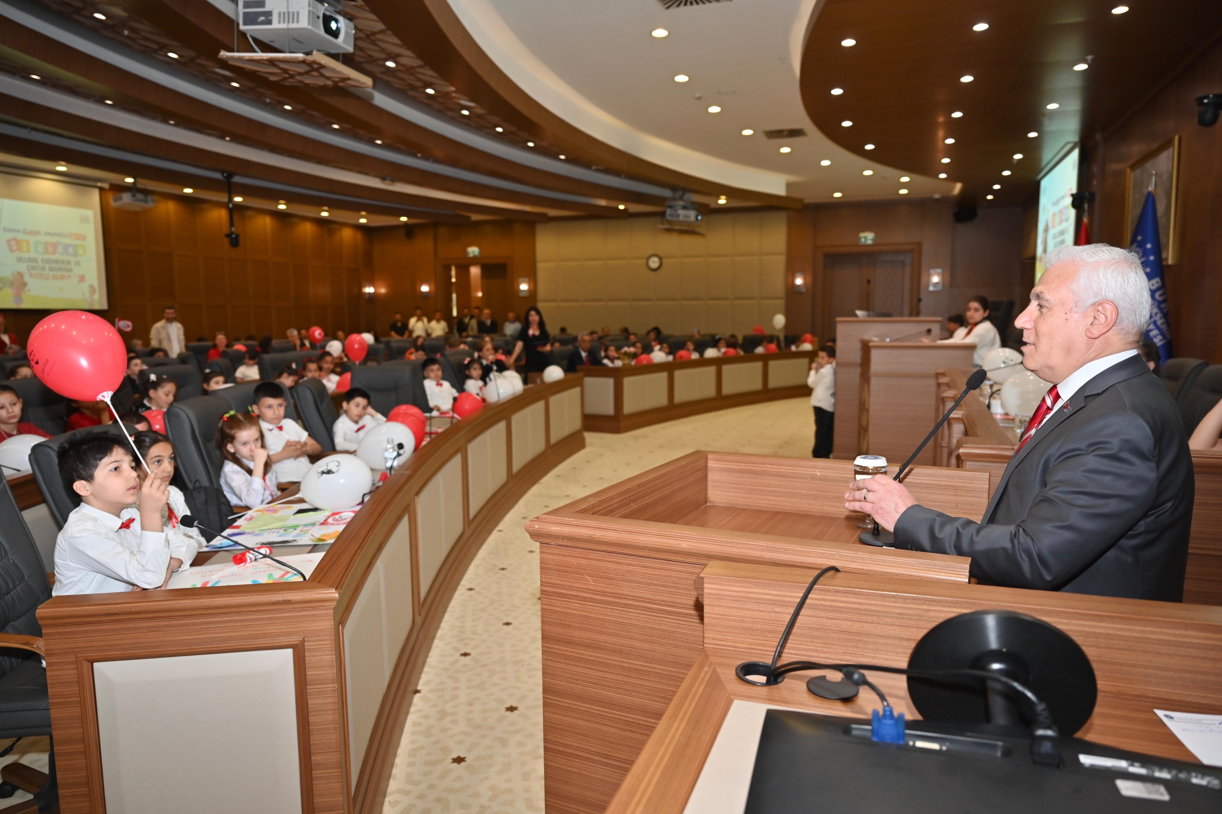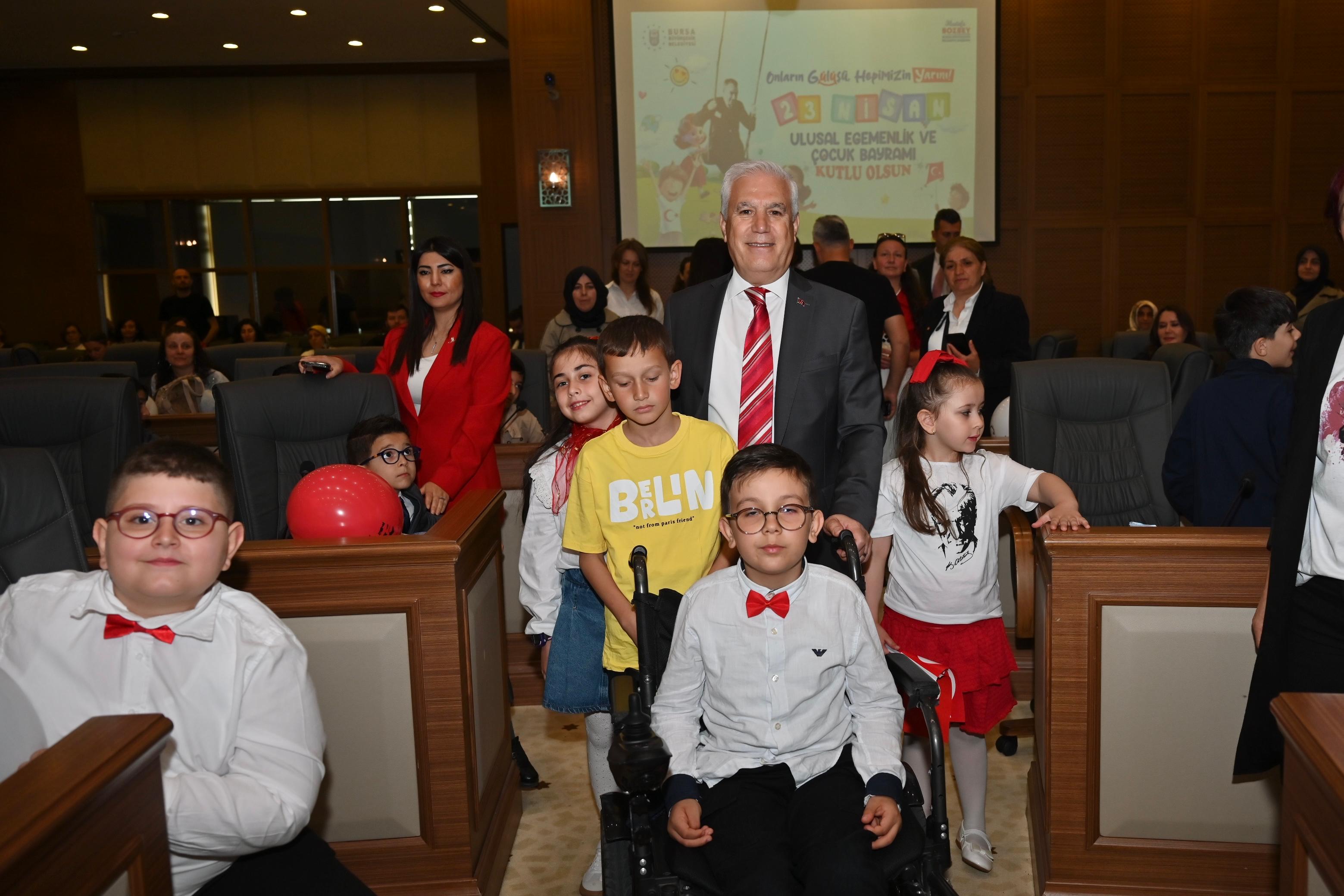 23 Nisan Ulusal Egemenlik ve Çocuk Bayramı ile TBMM’nin açılışının yıl dönümü kutlamaları kapsamında ‘Bursa Büyükşehir Belediye Meclisi Çocuk Oturumu’ Başkan Bozbey’in katılımıyla gerçekleşti. Bursa Büyükşehir Belediye Başkanı Mustafa Bozbey’in koltuğuna oturan Bursa Kent Konseyi Çocuk Meclisi Başkanı Yağız Vatansever ve Çocuk Meclisi yürütme kurulu üyesi İnci Bade Yiğit, çocuklar adına oturum başlangıç konuşmasını gerçekleştirdi.