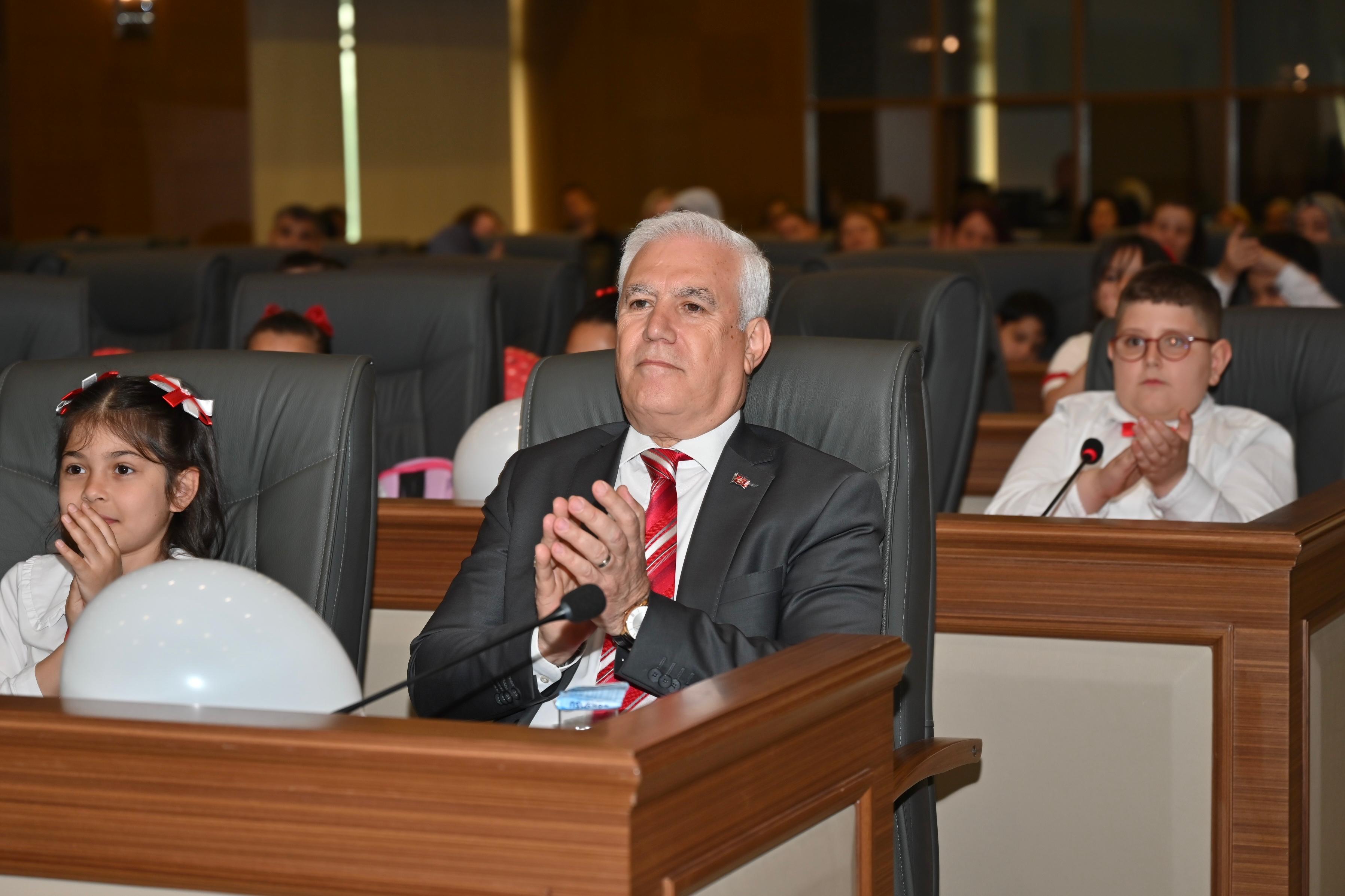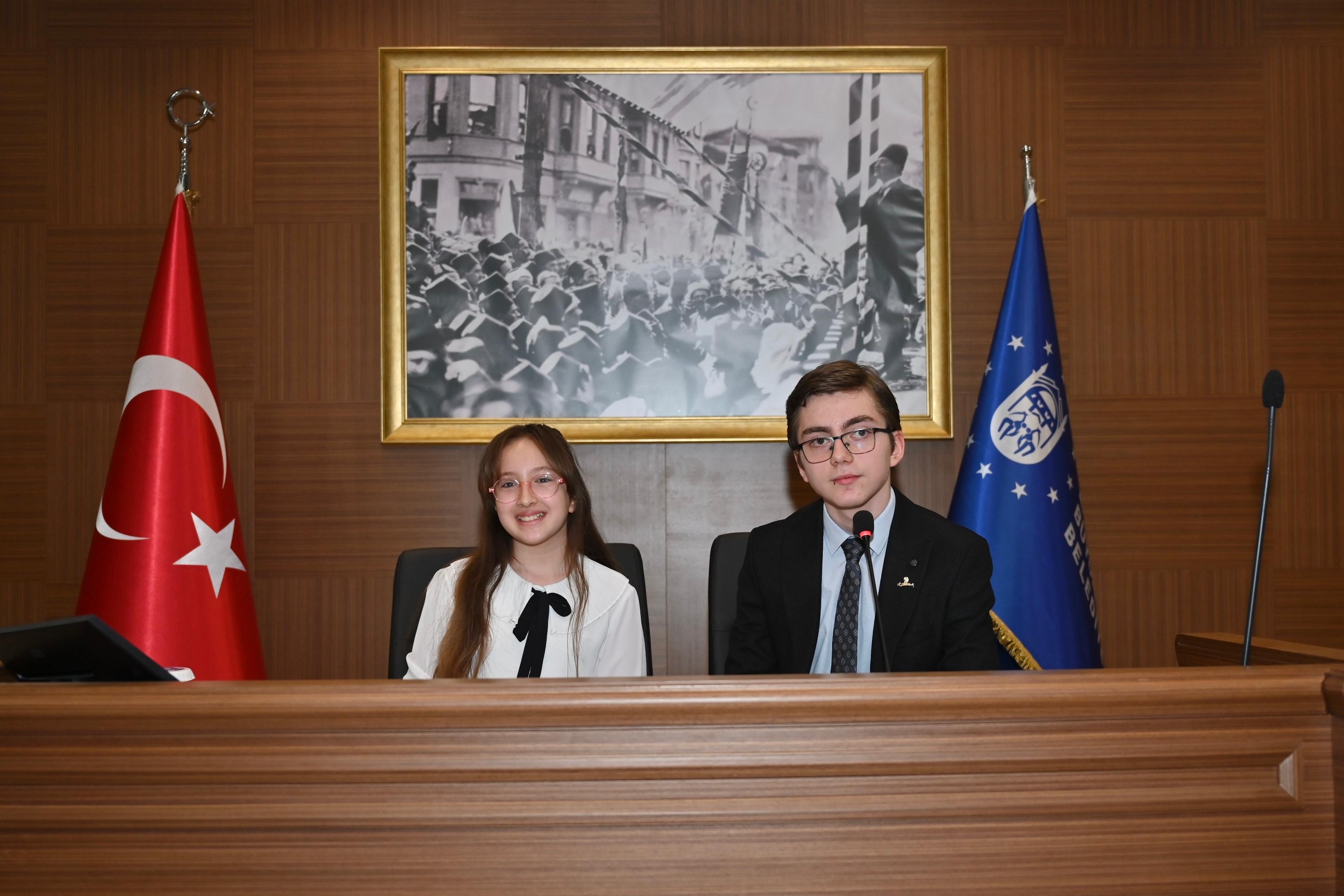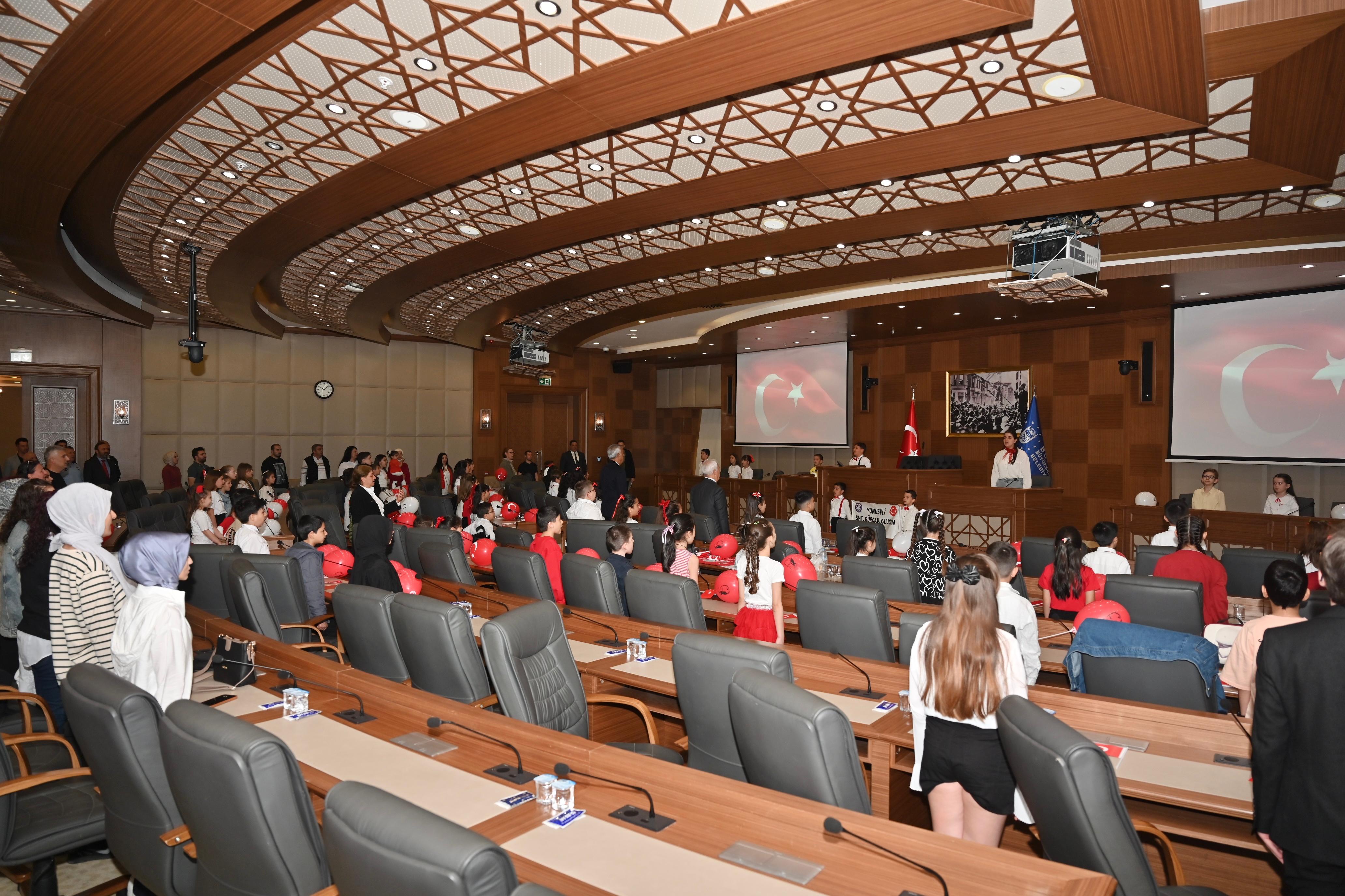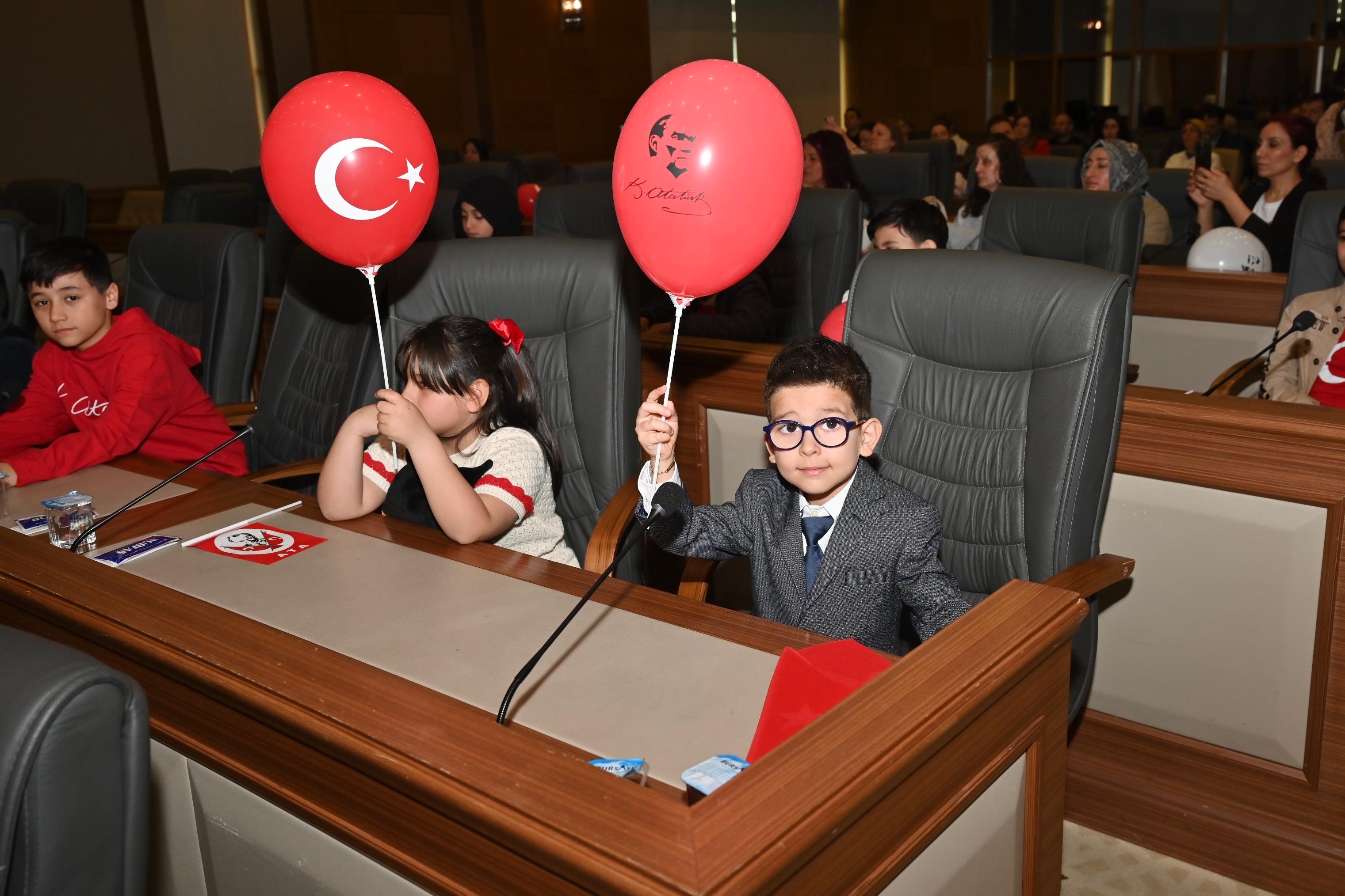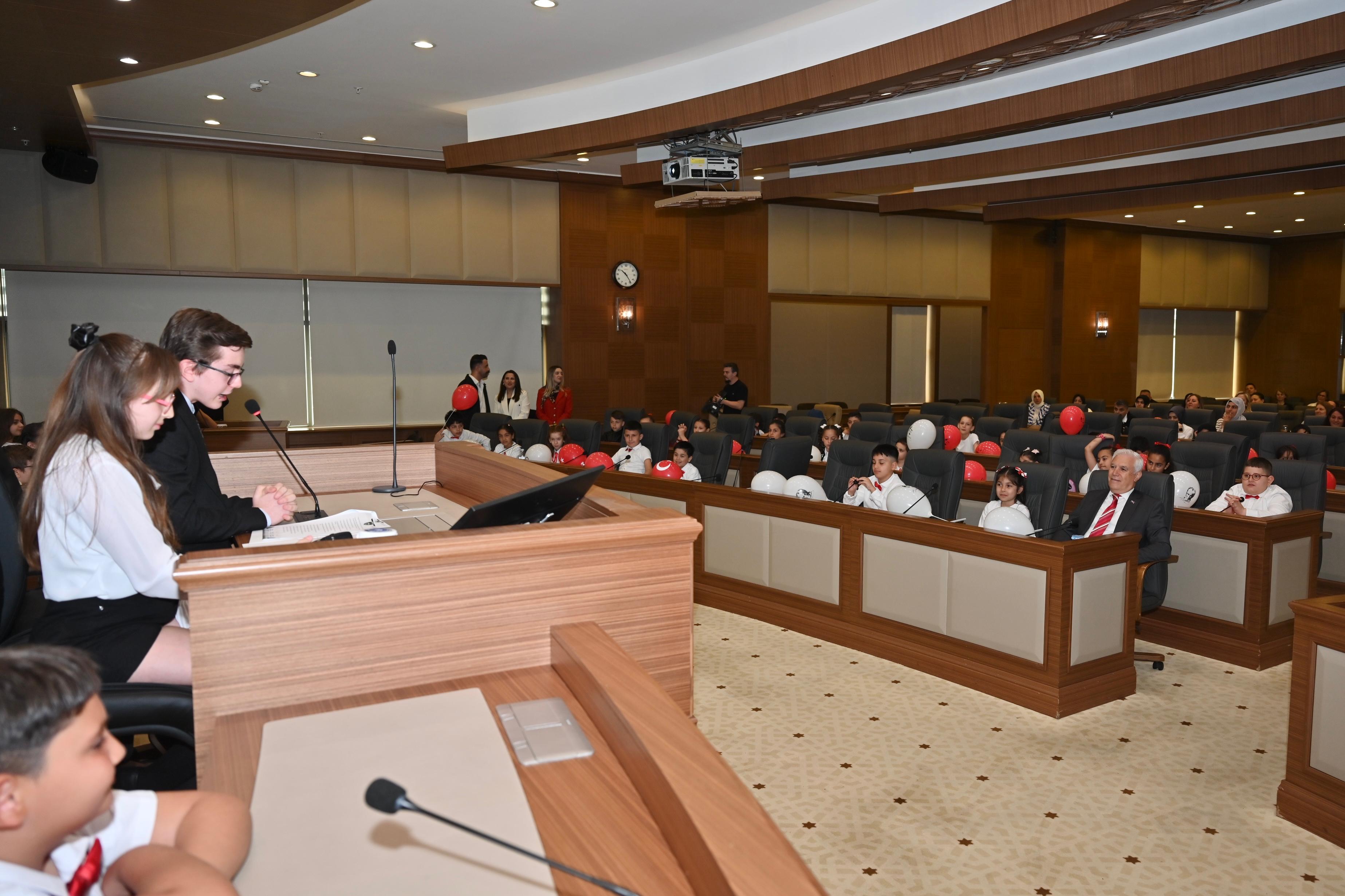 23 Nisan Ulusal Egemenlik ve Çocuk Bayramı ile TBMM’nin açılışının yıl dönümü kutlamaları kapsamında ‘Bursa Büyükşehir Belediye Meclisi Çocuk Oturumu’ Başkan Bozbey’in katılımıyla gerçekleşti. Bursa Büyükşehir Belediye Başkanı Mustafa Bozbey’in koltuğuna oturan Bursa Kent Konseyi Çocuk Meclisi Başkanı Yağız Vatansever ve Çocuk Meclisi yürütme kurulu üyesi İnci Bade Yiğit, çocuklar adına oturum başlangıç konuşmasını gerçekleştirdi.