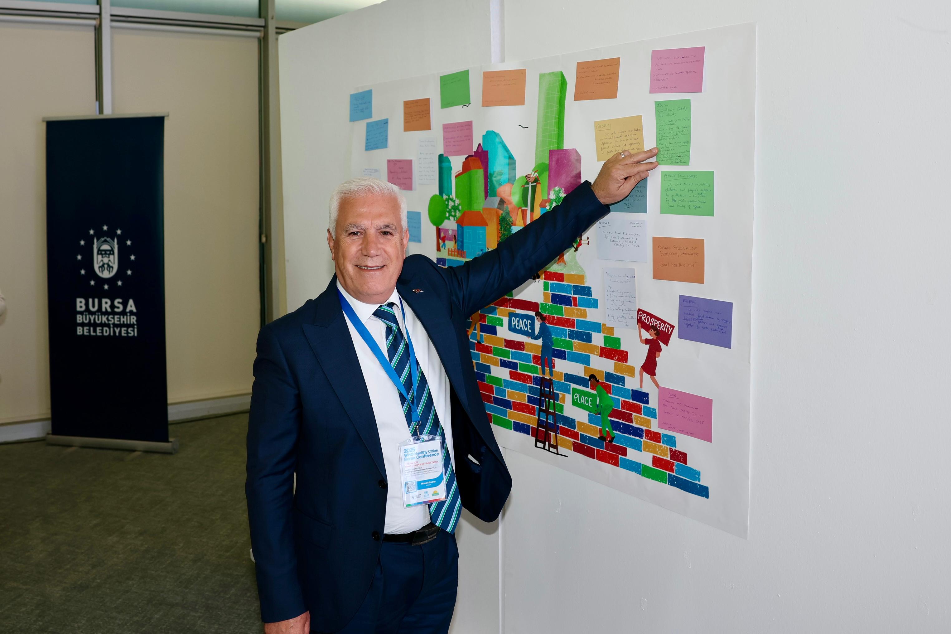Toplantıya katılan yerel yönetim temsilcileri de kendi kentlerine dair proje ve iyi niyet mesajlarını “Bursa Taahhüt Duvarı”na yapıştırarak ortak amaç ve sorumluluklara dikkat çekti.