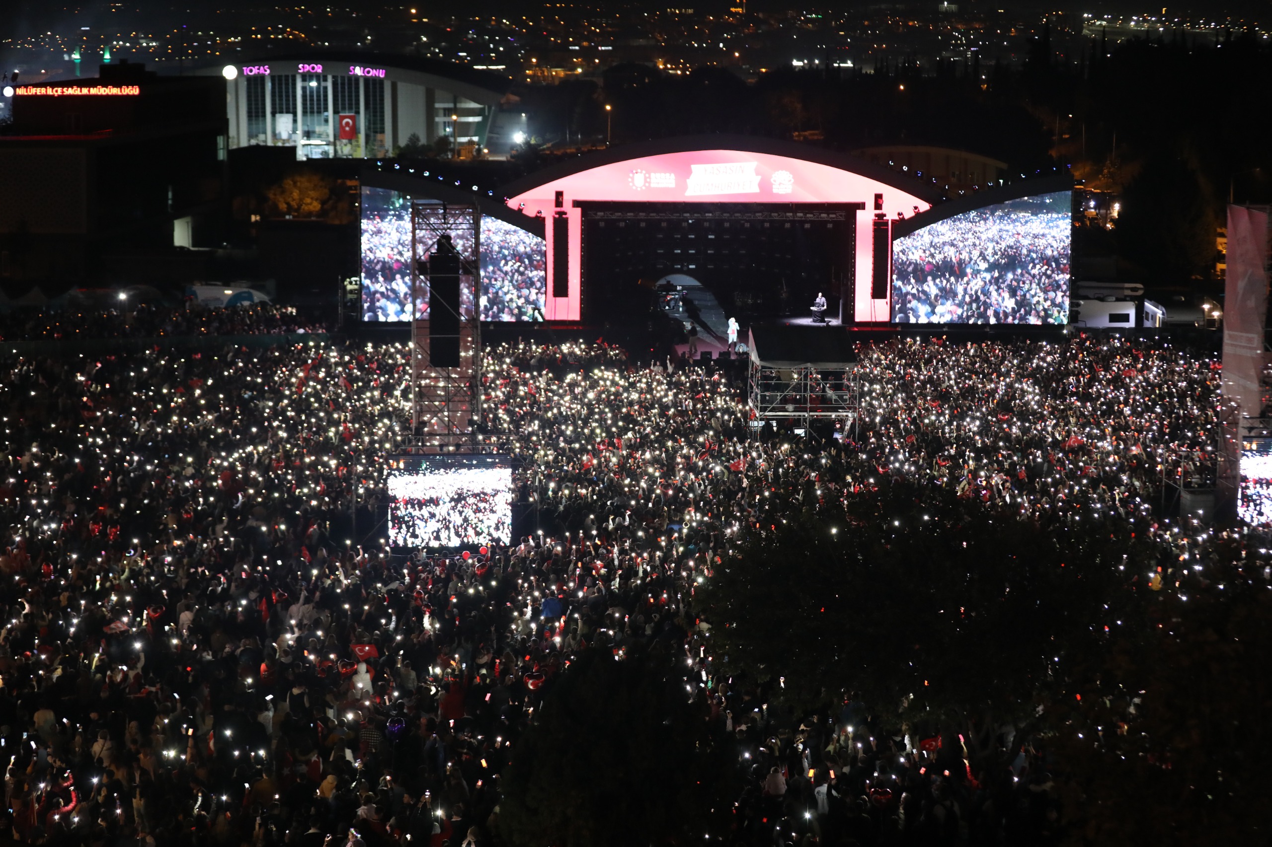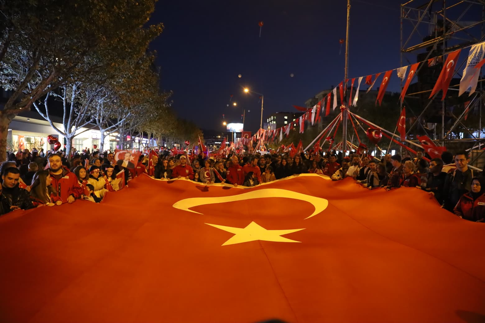Kutlamaların ikinci adresi, yürüyüşün sona erdiği Hastane Alanı oldu. Bursa Büyükşehir Belediye Başkanı Mustafa Bozbey, Nilüfer Belediye Başkanı Şadi Özdemir, CHP Bursa İl Başkanı Nihat Yeşiltaş ve Bursa milletvekilleri sahneye çıkarak Türk bayraklarıyla halkı selamladı. Alanı ve yolları dolduran vatandaşlar, saygı duruşunun ardından İstiklal Marşı’nı büyük bir coşkuyla okudu.