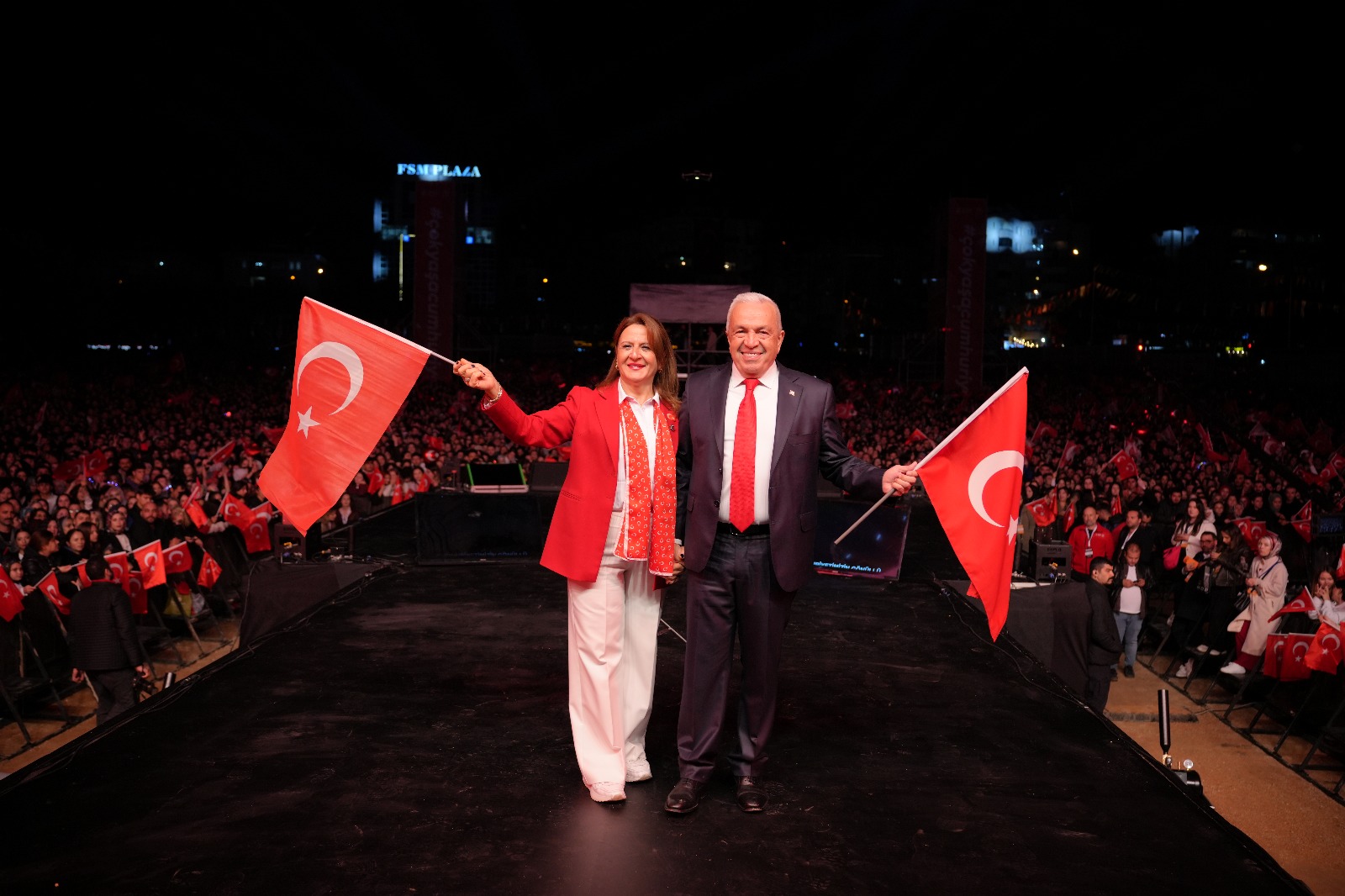 Eşi Seden Bozbey ile birlikte sahneye çıkan Bursa Büyükşehir Belediye Başkanı Mustafa Bozbey, vatandaşların Cumhuriyet Bayramı’nı kutladı. Alanı dolduranları, “Hoş geldiniz! Cumhuriyetimizin gönüllü neferleri. Güzel Bursamızın yürekli insanları. Cumhuriyetimizin 102. yıl kutlamalarına hoş geldiniz” diyerek selamlayan Başkan Mustafa Bozbey, “Bugün gurur günümüz. Bugün en büyük bayramımız. Bir millet olarak bağımsızlığımızı dünyaya ilan ettiğimiz en mutlu günümüz. Bayramımız kutlu olsun. Cumhuriyetimizin 102. yılı kutlu olsun. Güzel Bursamız, Cumhuriyet’e hep sahip çıktı. Her zaman da sahip çıkacak. Her 29 Ekim günü, Cumhuriyet Bayramımızı FSM’de yüz binlerle birlikte coşkuyla kutluyoruz. Hiç bitmeyen tutkuyla, Cumhuriyet sevdamızı haykırıyoruz. Dünya bilsin ki, Cumhuriyet vazgeçilmezimizdir. En büyük sevdamız” dedi.