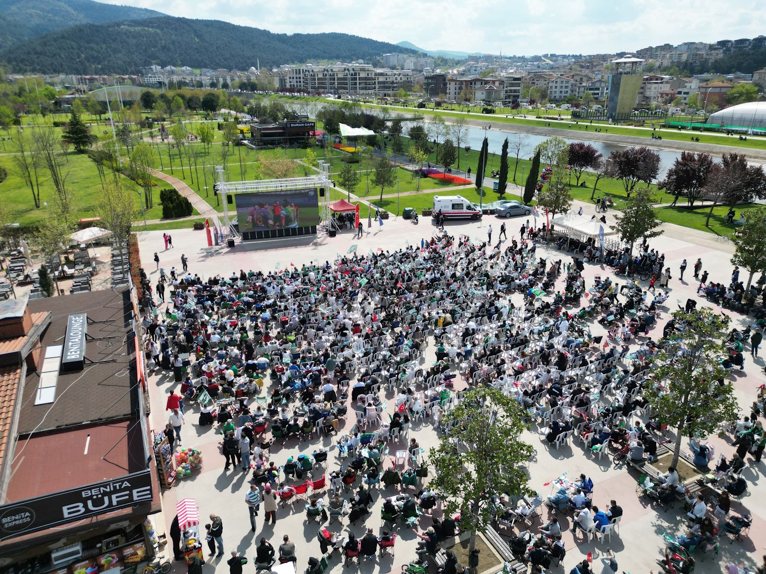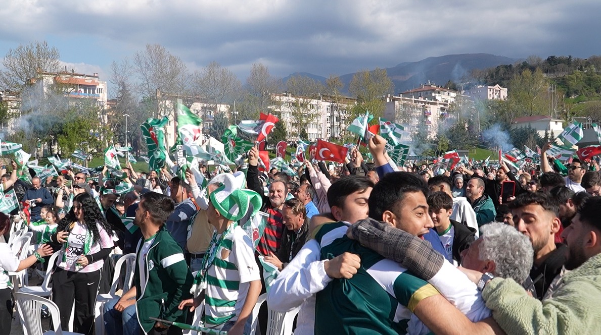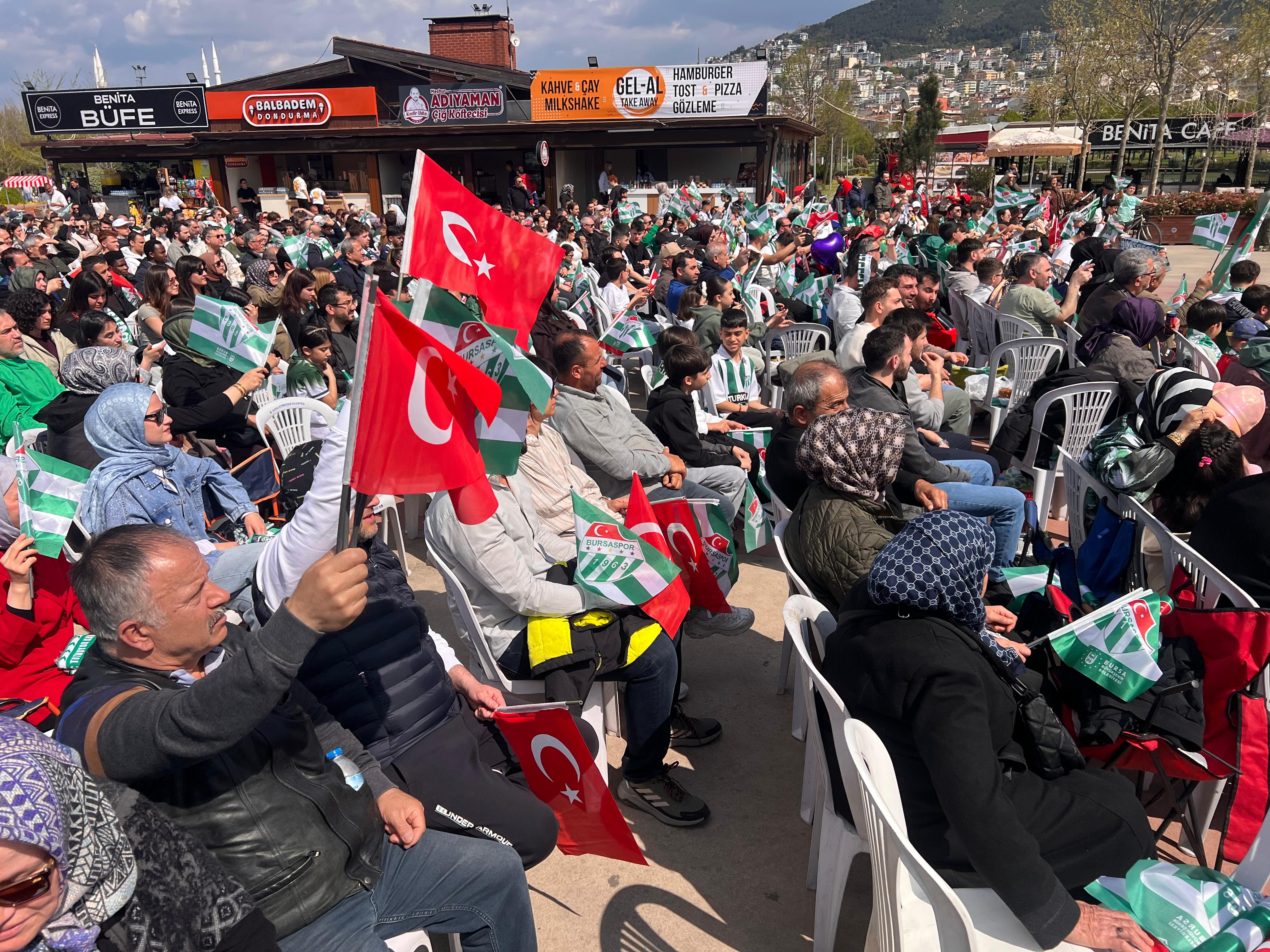BURSA BÜYÜKŞEHİR BELEDİYESİ TARAFINDAN KURULAN DEV EKRANLARDAN BURSASPOR MAÇINI İZLEYEN YEŞİL BEYAZLI TARAFTARLAR, BİTİŞ DÜDÜĞÜYLE BİRLİKTE ŞAMPİYONLUK COŞKUSUNU DOYASIYA YAŞADI.